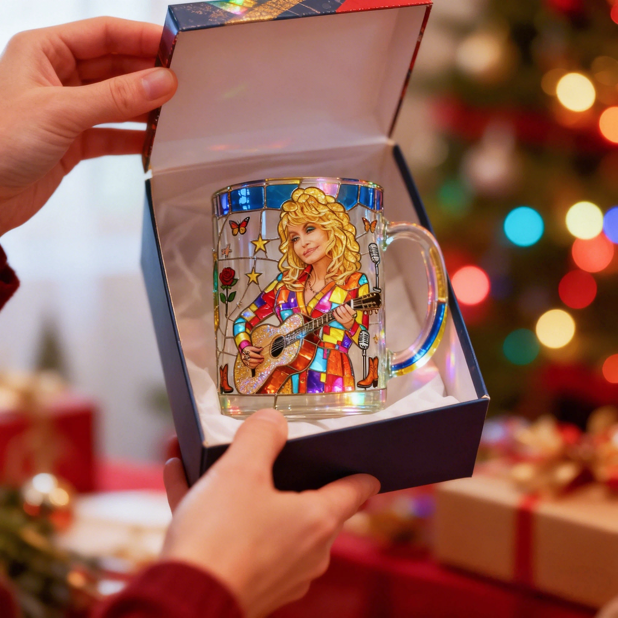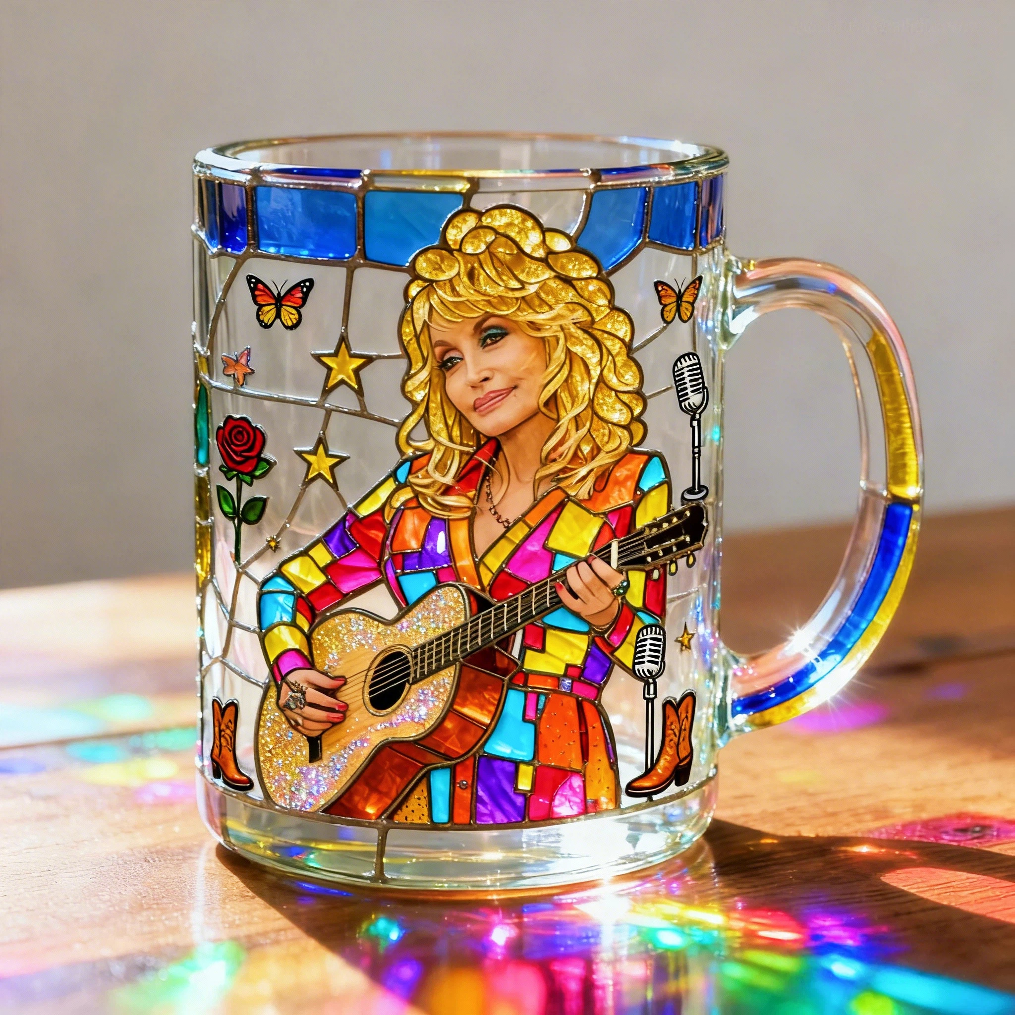 ✨Featuring radiant stained-glass colors and Dolly holding her guitar, the mug glows beautifully in natural light. A unique collectible that makes every coffee break feel inspiring.